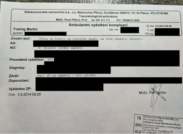 - zdravotní záznam dokazuje jen to, že hráč Martin Tvarog utrpěl poranění ruky. Ze záznamu ani není patrné, že šlo o zlomeninu
