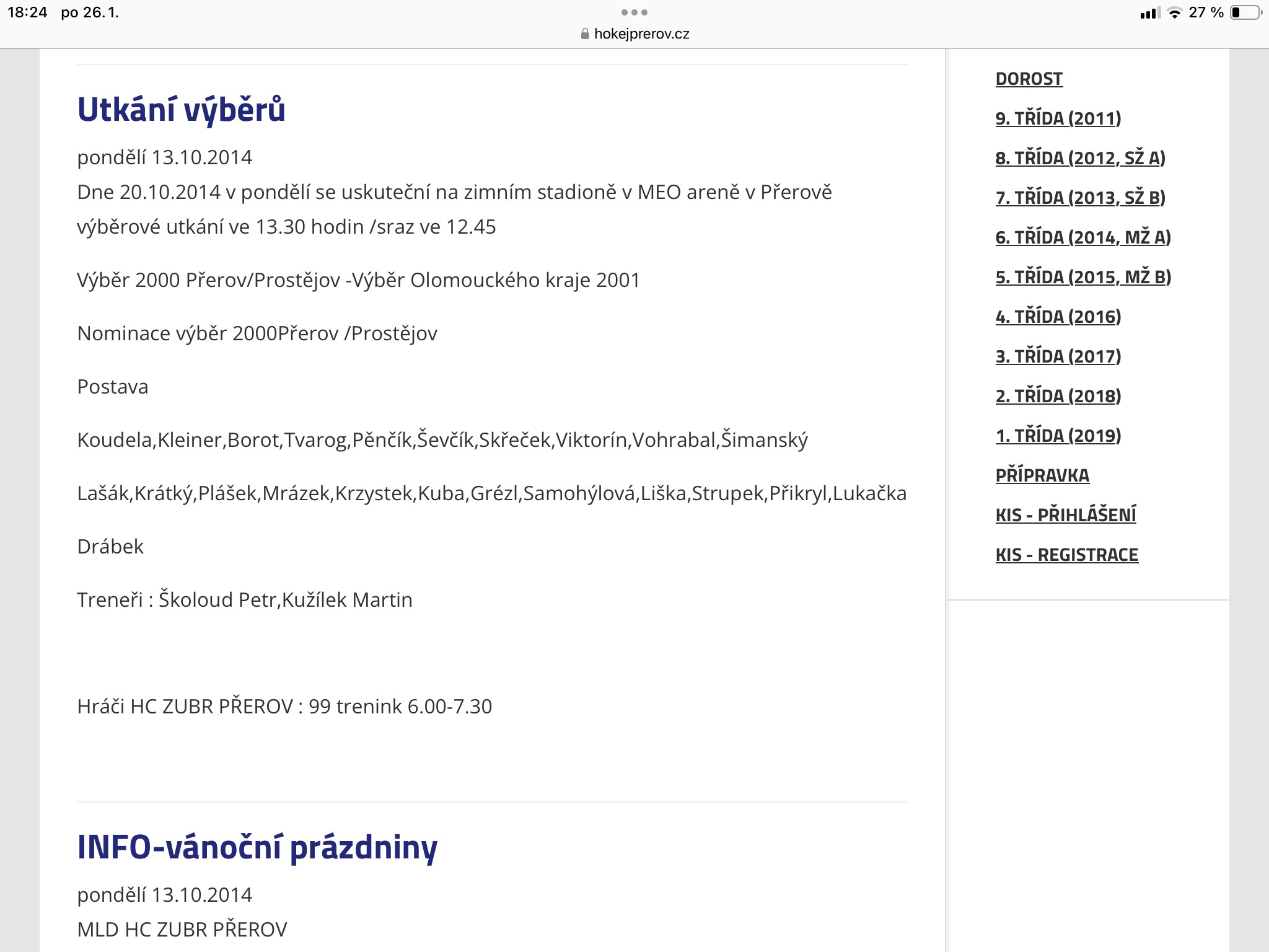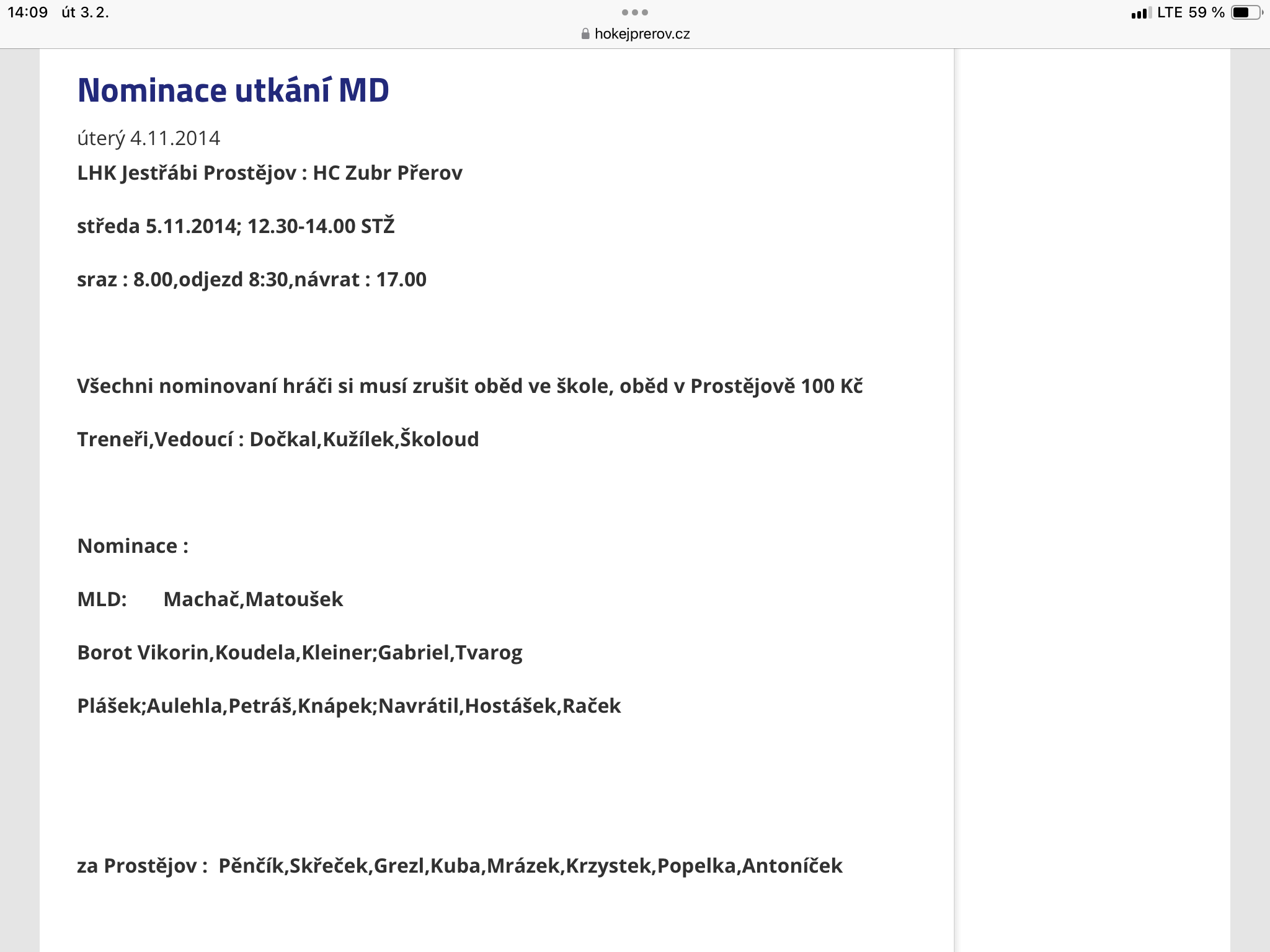 4.11.2014 - Nominace na utkání mladšího dorostu Prostějov - Přerov