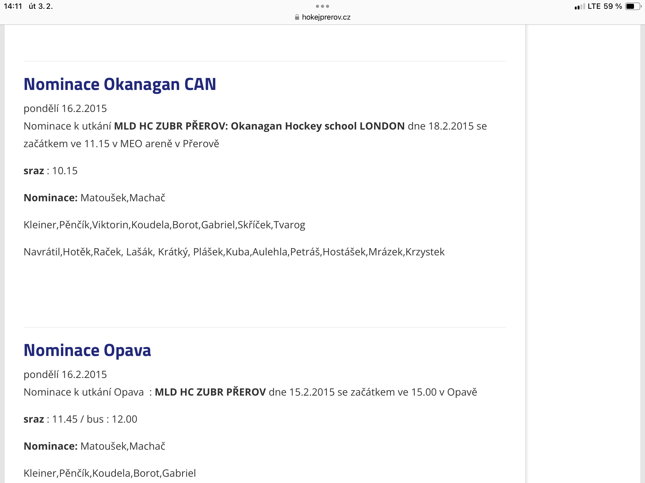 16.2.2015 - Nominace na utkání mladšího dorostu proti Okanangan CAN