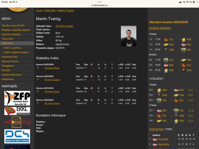 Doložení osobní karty hráče z Kroměřížské hokejové ligy, kde je vyznačeno, kdy hráč naposledy odehrál soutěžní zápas (verze z 27.1.2026)