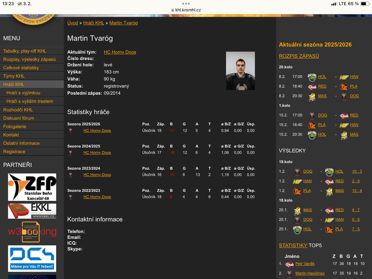Osobní karta hráče z Kroměřížské hokejové ligy, kde je vyznačeno, kdy hráč naposledy odehrál soutěžní zápas (verze z 3.2.2026)