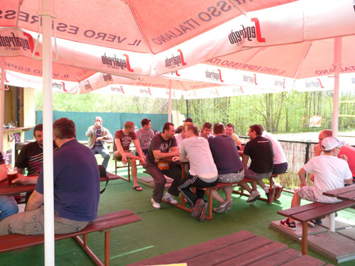 Když už byly konečně odevzdány všechny klíče a autobus naložen, scházeli se účastníci zájezdu na oblíbené zahrádce před zimákem. Velká pařící trojka ve složení Flajši-Stýblo-Gajda, kteří si poprvé padli do oka již v sobotu nad ránem kdy zavřeli a znovuotevřeli kiosek na zahrádce (vlastně základ to mělo již v pátek po cestě autobusem), shromáždila kolem sebe několik dalších nadšenců a ti se s Nymburkem nemohli rozloučit.